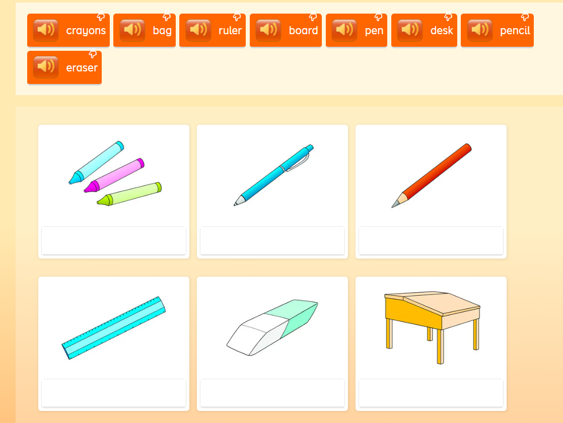 A continuación os proponemos un juego con vocabulario relacionado con el topic school. Pinchad en el audio y arrastrad la palabra hasta el dibujo correcto. ¡Disfrutad!