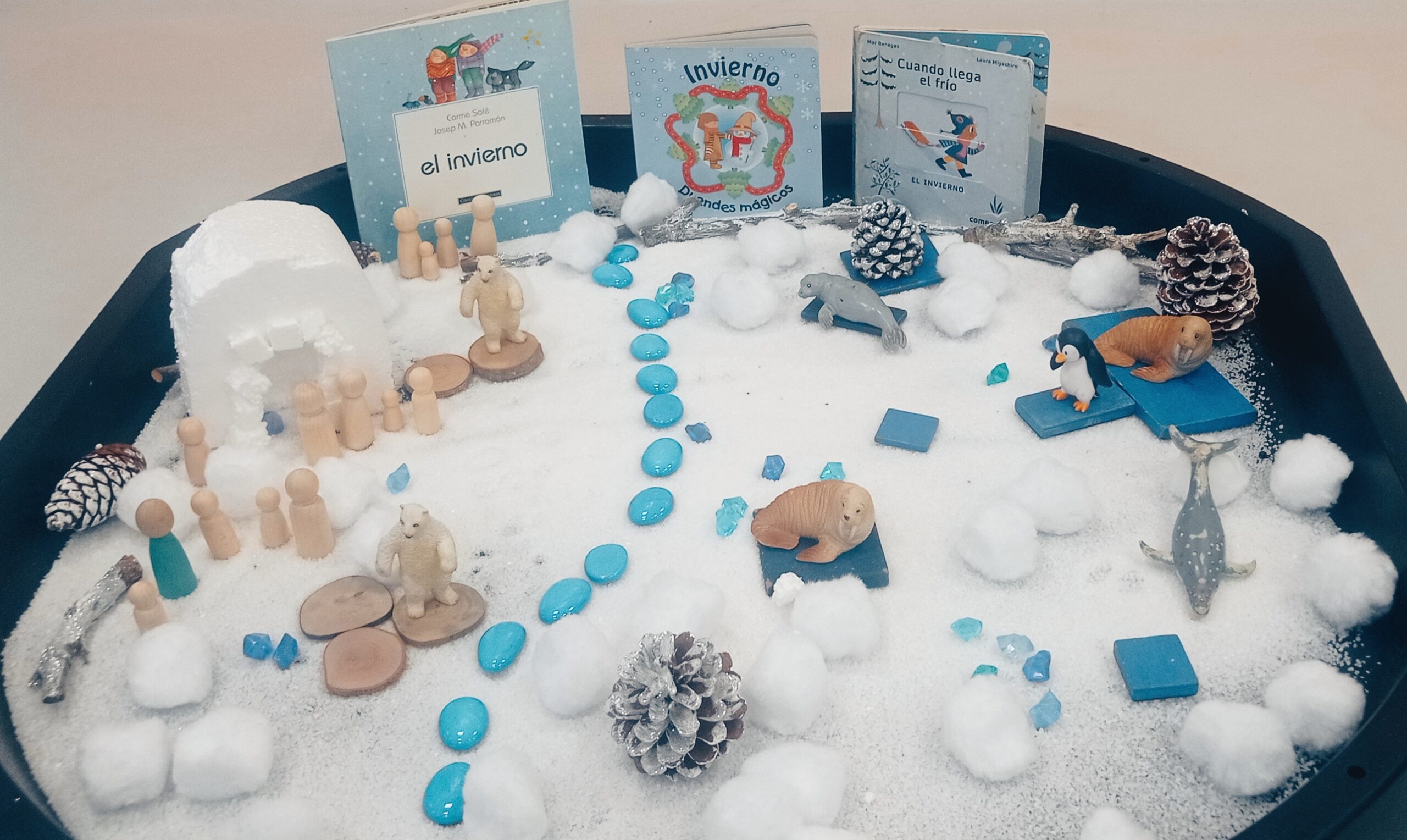 Pero esto no acaba…. en los días posteriores descubrieron una instalación de invierno. Un espacio lleno de elementos fríos, texturas variadas, materiales manipulativos y estímulos visuales que sin muchas palabras les motivó a experimentar y aprender a través de los sentidos.