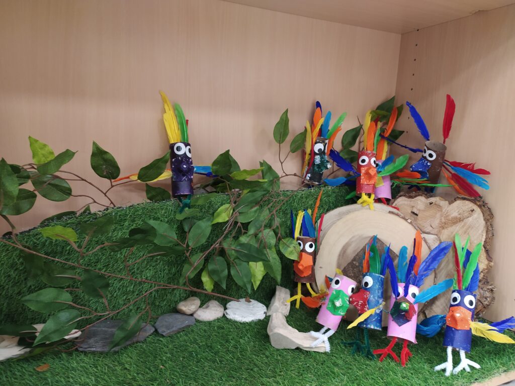 Por otro lado, seguimos aprendiendo mucho de los animales. Esta vez hemos investigado las características de las aves para poder crear un original pájaro utilizando material reciclado fomentando el cuidado del medio ambiente. Lo hemos realizado por parejas de gemelos, compartiendo los aprendizajes y tomando pequeñas decisiones, respetando las propuestas del compañero para ponernos de acuerdo.