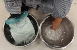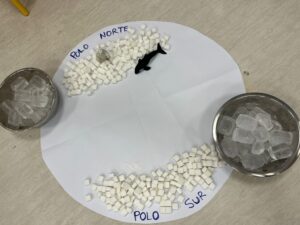 Para completar este aprendizaje, hemos vuelto a formular un nuevo interrogante, pero esta vez sobre los animales polares. Conversamos sobre sus características y su hábitat, de las condiciones climáticas de los polos, de todo lo que saben sobre los pingüinos y entonces surgió la curiosidad, ¿pueden vivir los leones o las jirafas en el polo?¿por qué? y entonces… ¿Cómo pueden los animales polares sobrevivir a tanto frío? y tras conversar sobre las posibles hipótesis decidimos realizar un pequeño experimento para poder reflexionar y comprobar con nuestras propias manos, así seguimos construyendo aprendizajes significativos, fomentando el pensamiento crítico desde estas edades.