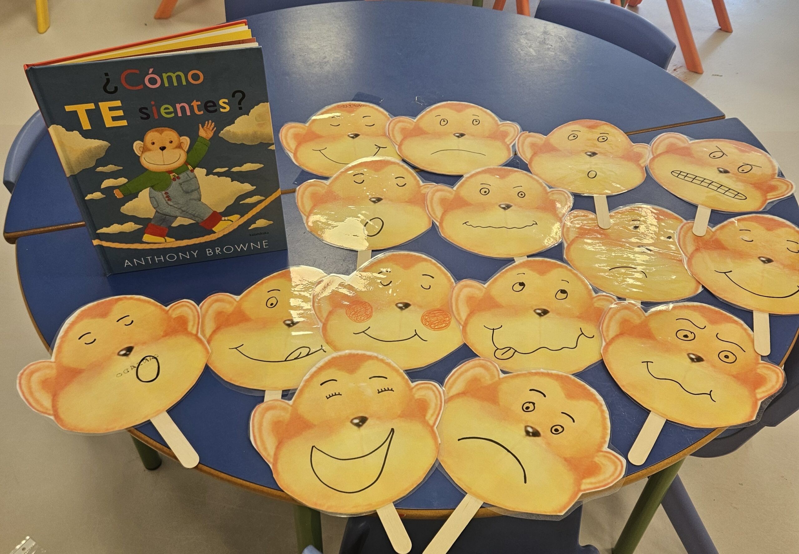 Estas caretas, estarán disponibles en el aula, dentro del rincón de la biblioteca, para poder jugar a representar el cuento y para poder expresar sus sentimientos. Os dejamos una foto del cuento y de las caretas que vamos a poder disfrutar dentro del rincón.