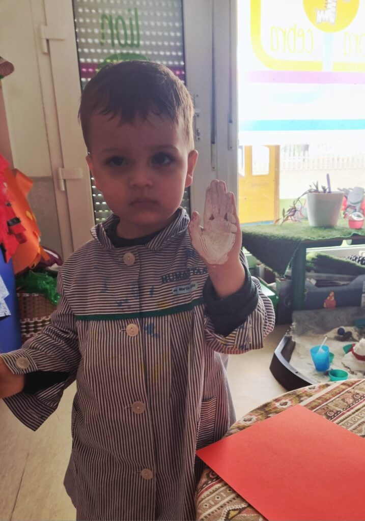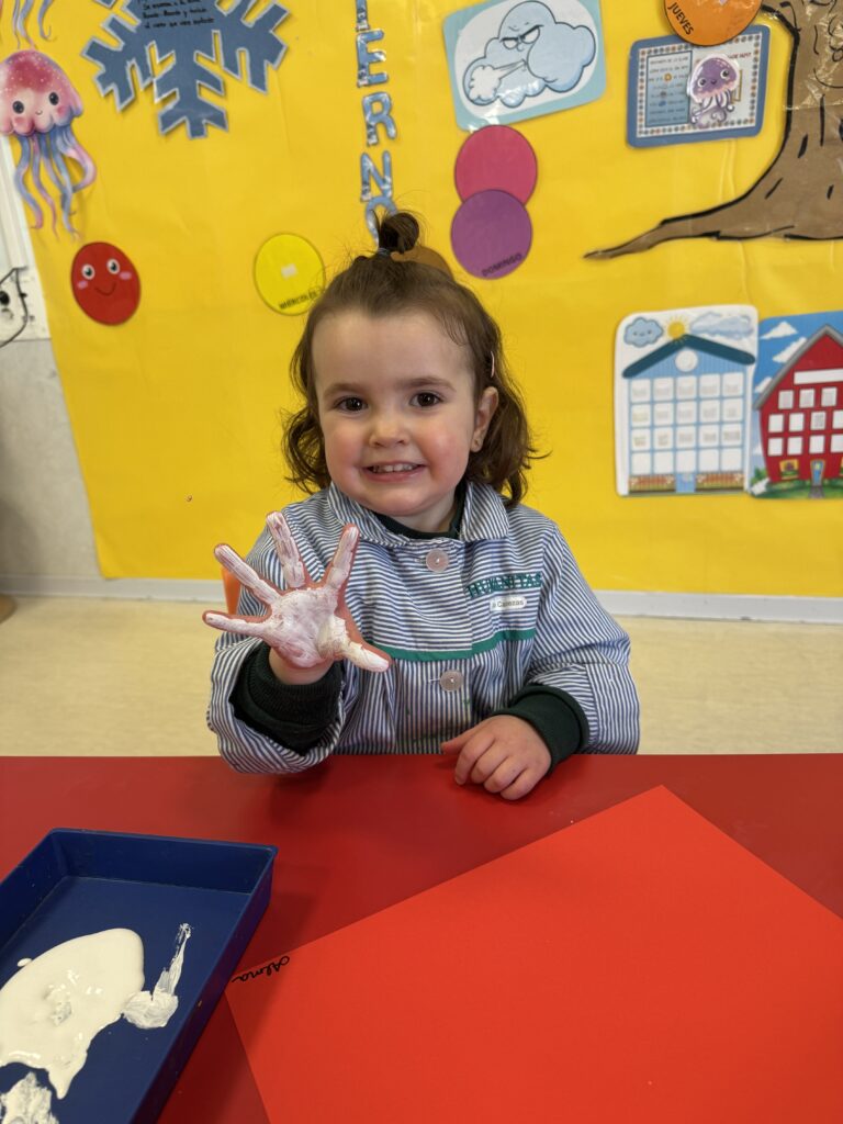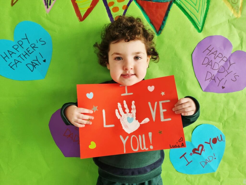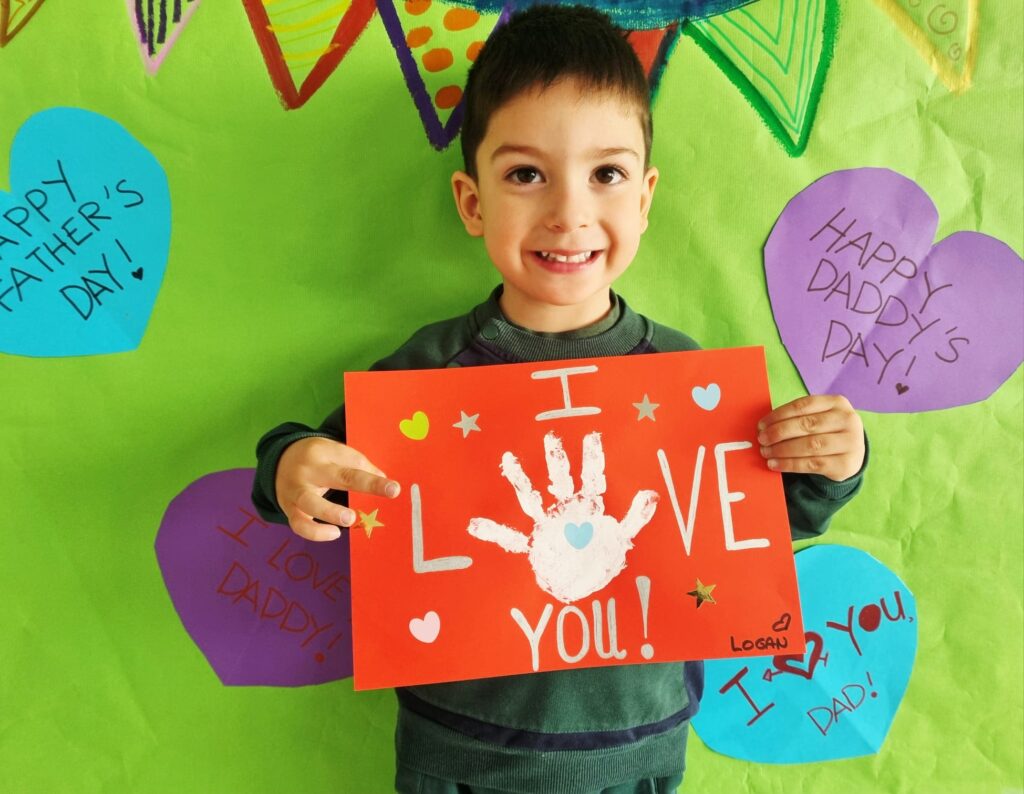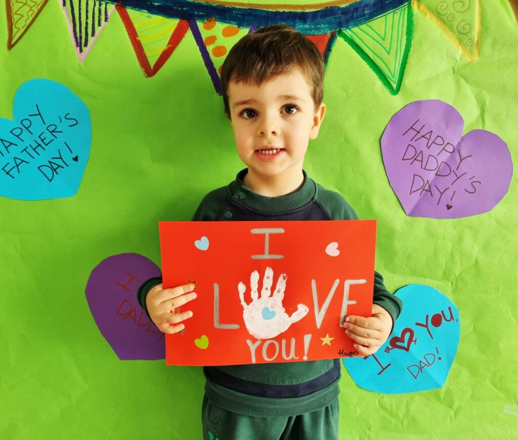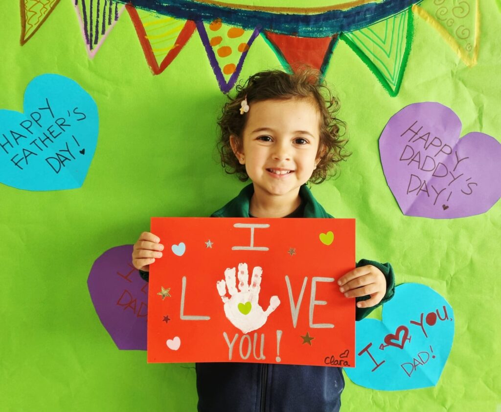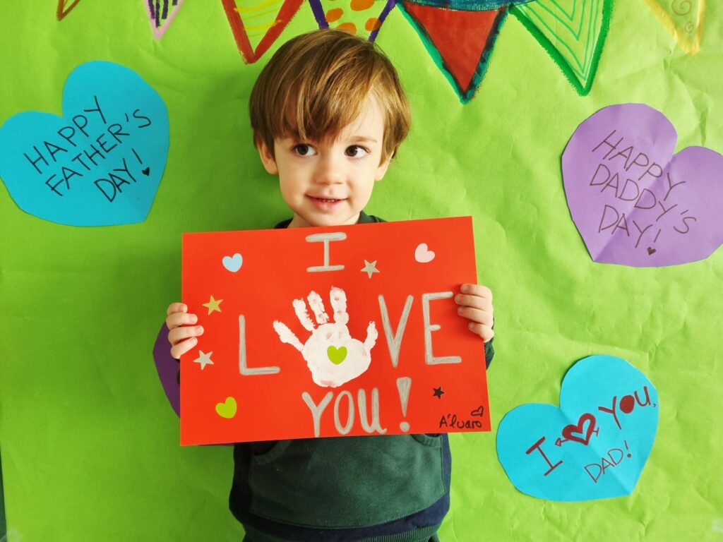 Nuestros pequeños crearon unas adorables tarjetas con la huella de su mano. Con la ayuda de sus profes, escribieron el mensaje “I love you” y decoraron sus tarjetas con pegatinas de corazones y estrellas de muchos colores. ¡Cada tarjeta quedó única, igual que nuestros peques!