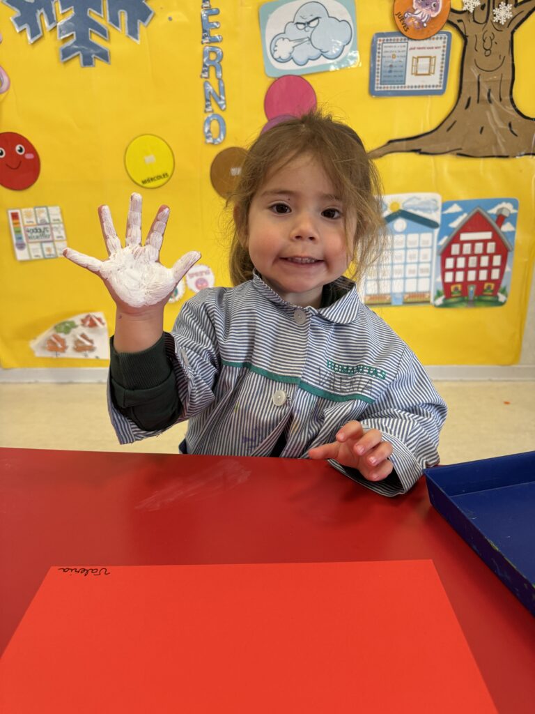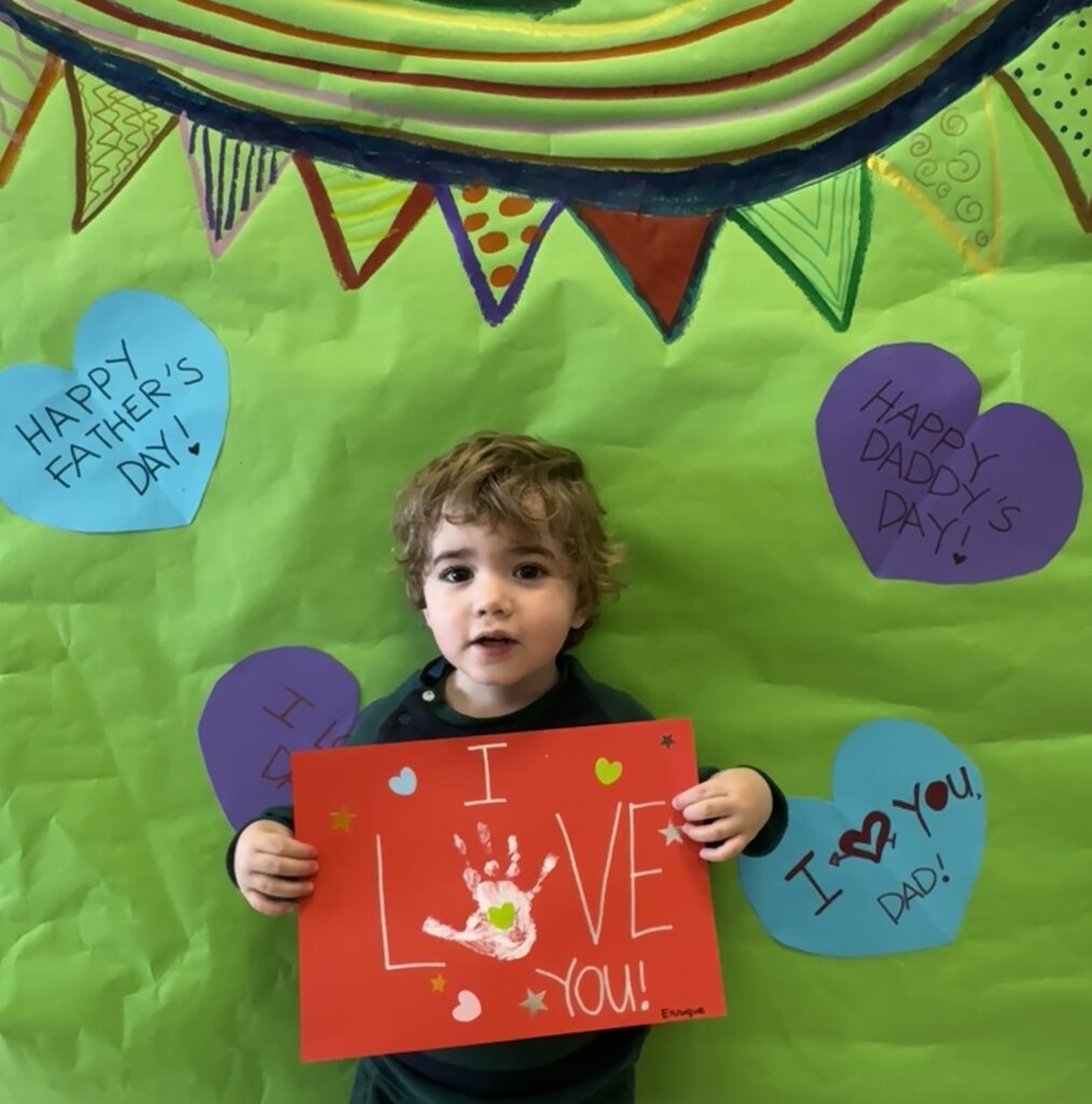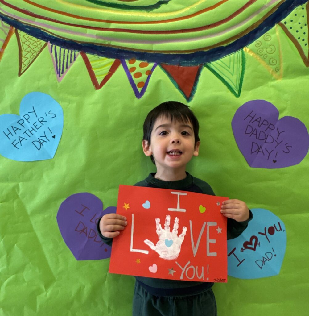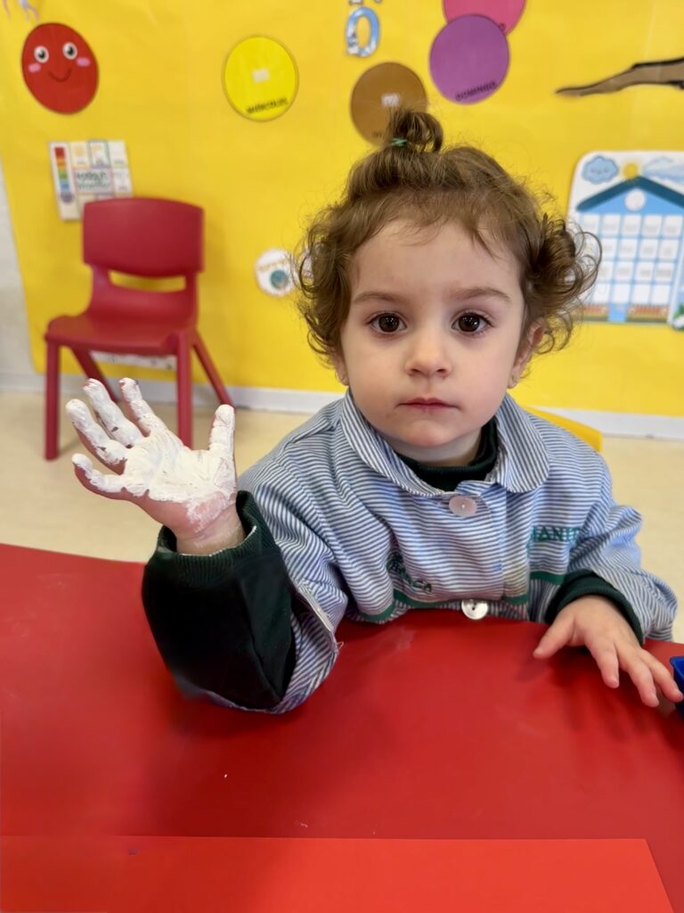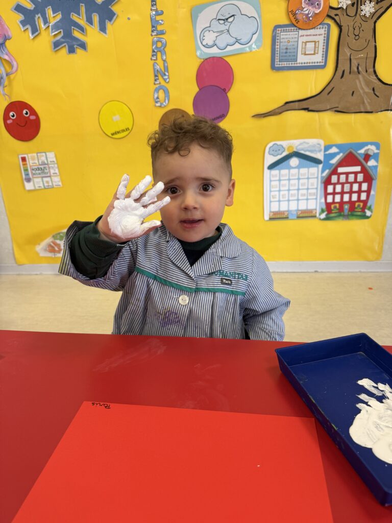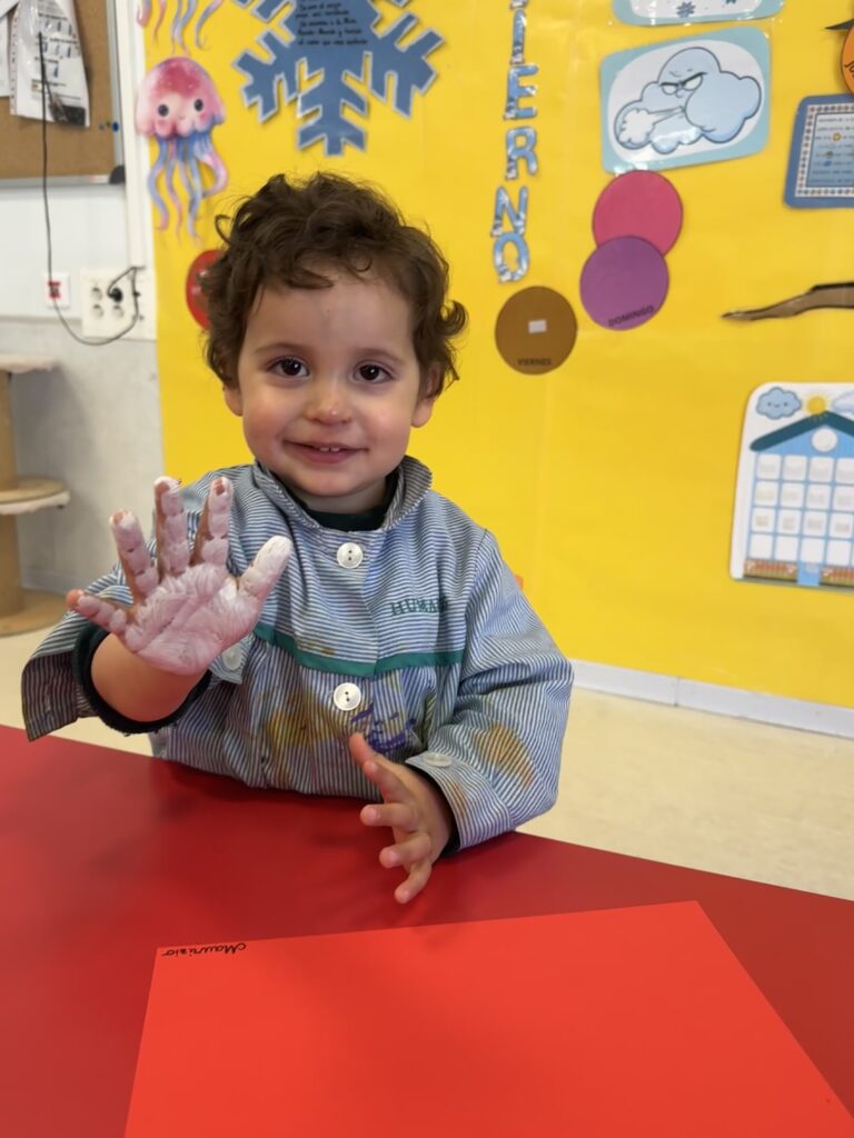 Nuestros pequeños crearon unas adorables tarjetas con la huella de su mano. Con la ayuda de sus profes, escribieron el mensaje “I love you” y decoraron sus tarjetas con pegatinas de corazones y estrellas de muchos colores. ¡Cada tarjeta quedó única, igual que nuestros peques!