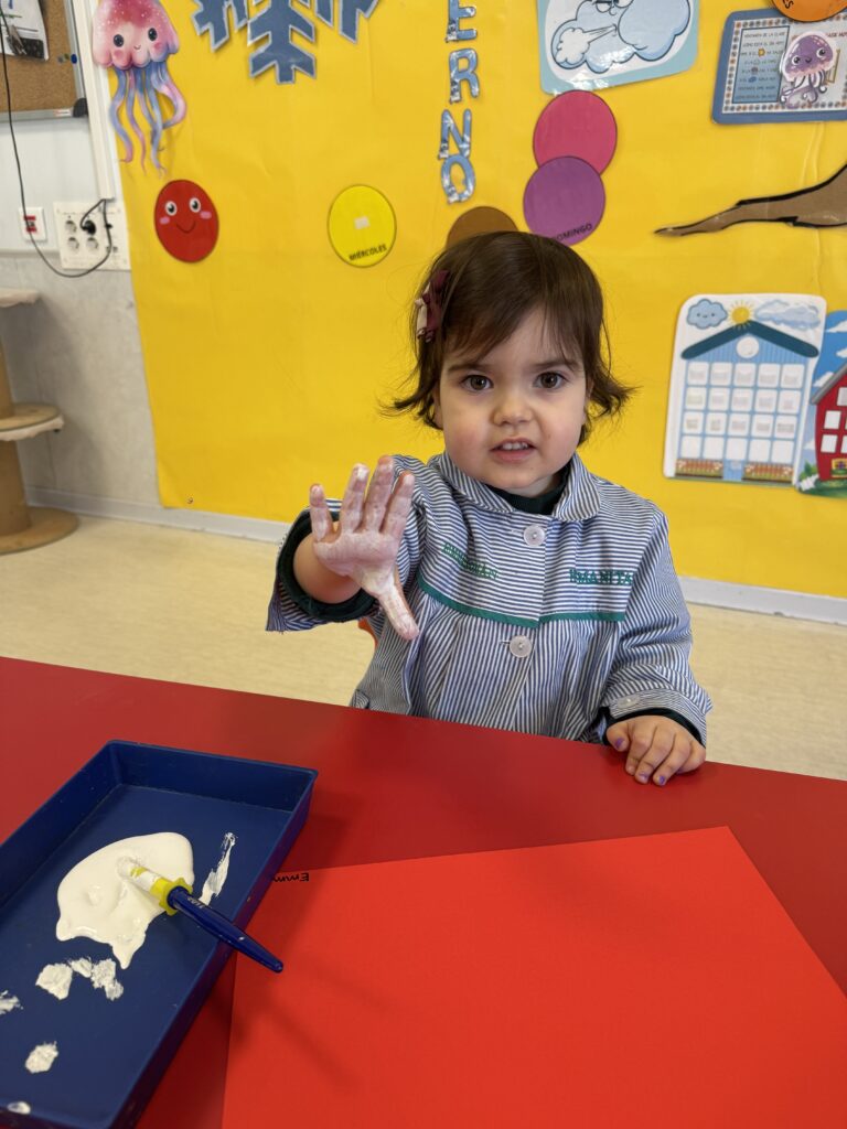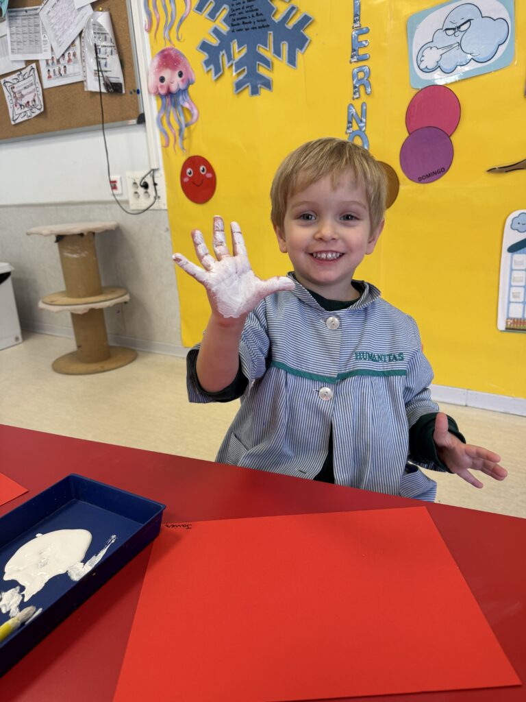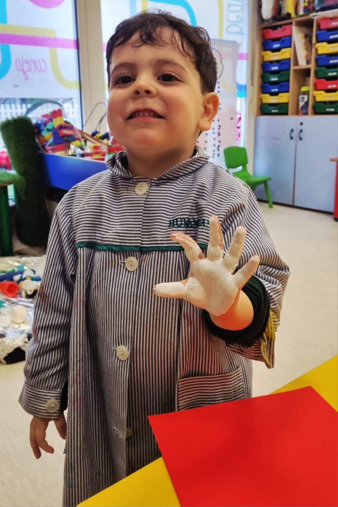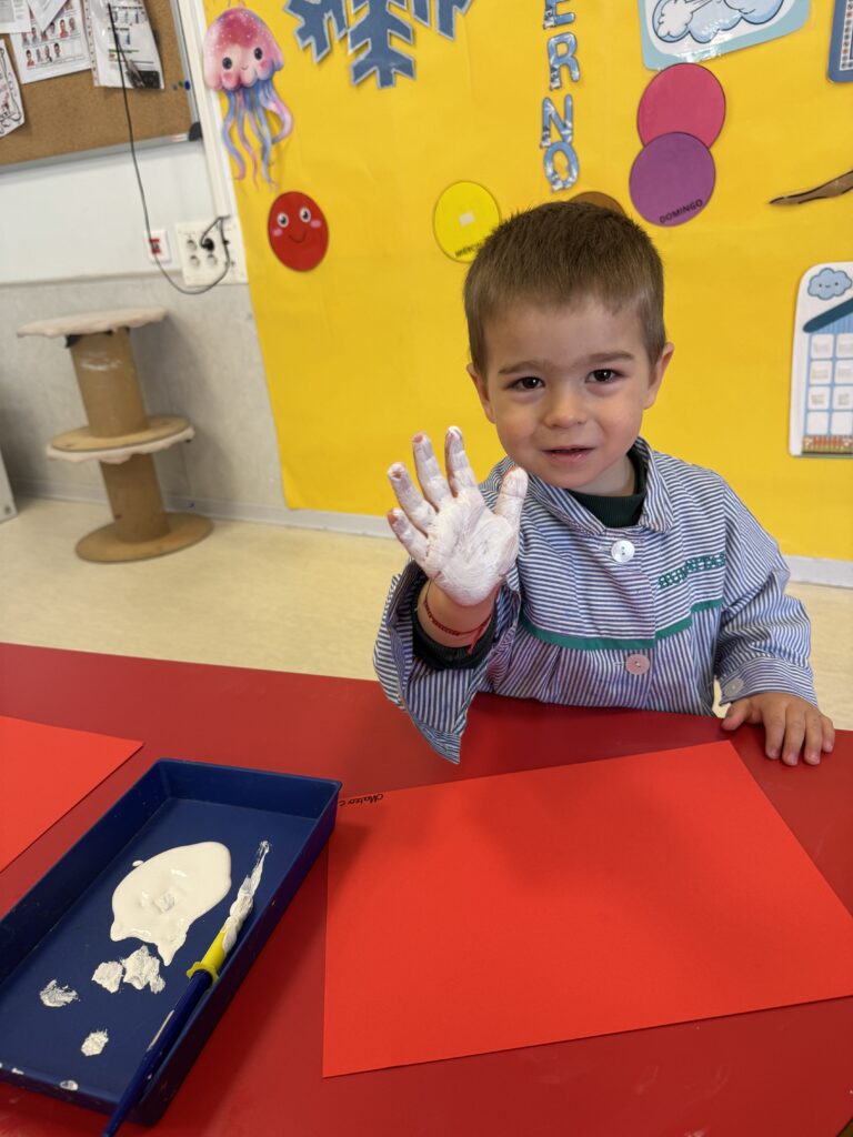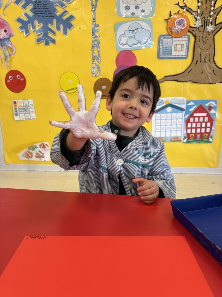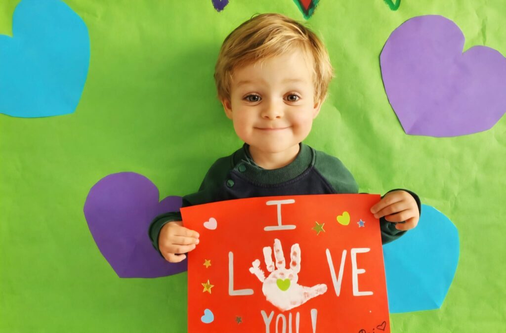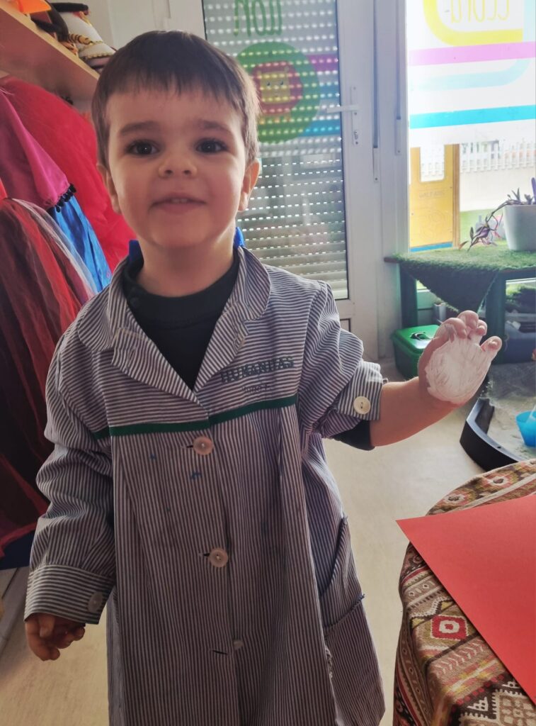 Nuestros pequeños crearon unas adorables tarjetas con la huella de su mano. Con la ayuda de sus profes, escribieron el mensaje “I love you” y decoraron sus tarjetas con pegatinas de corazones y estrellas de muchos colores. ¡Cada tarjeta quedó única, igual que nuestros peques!