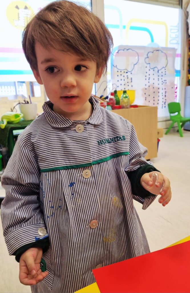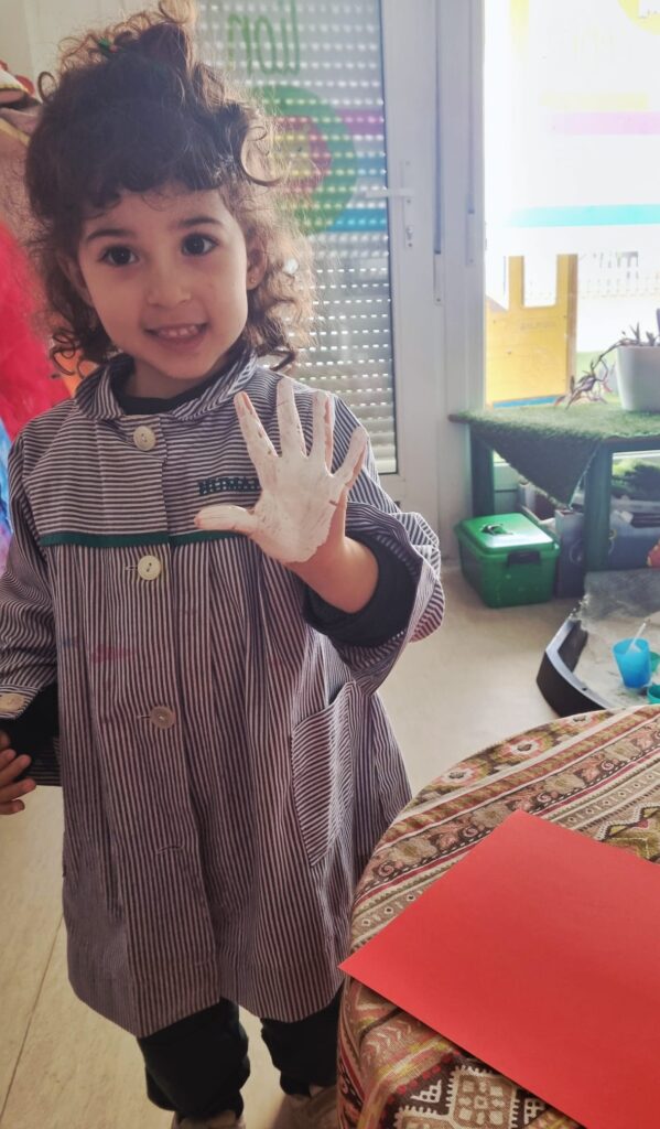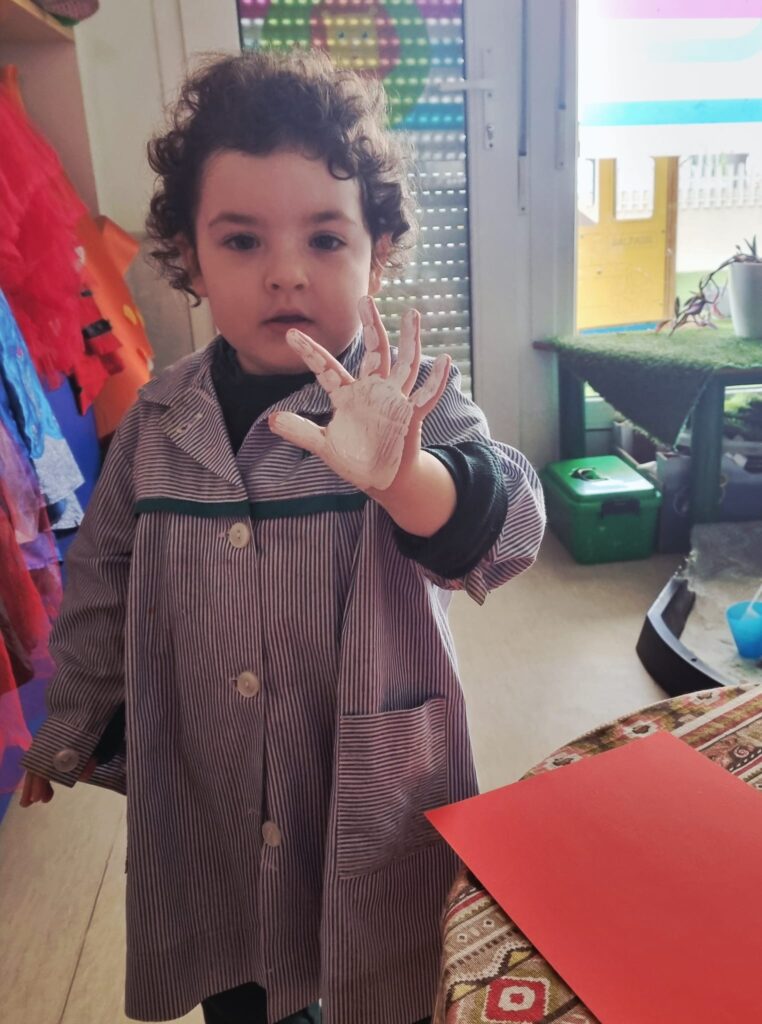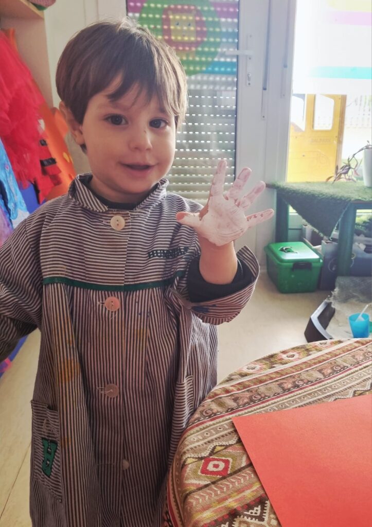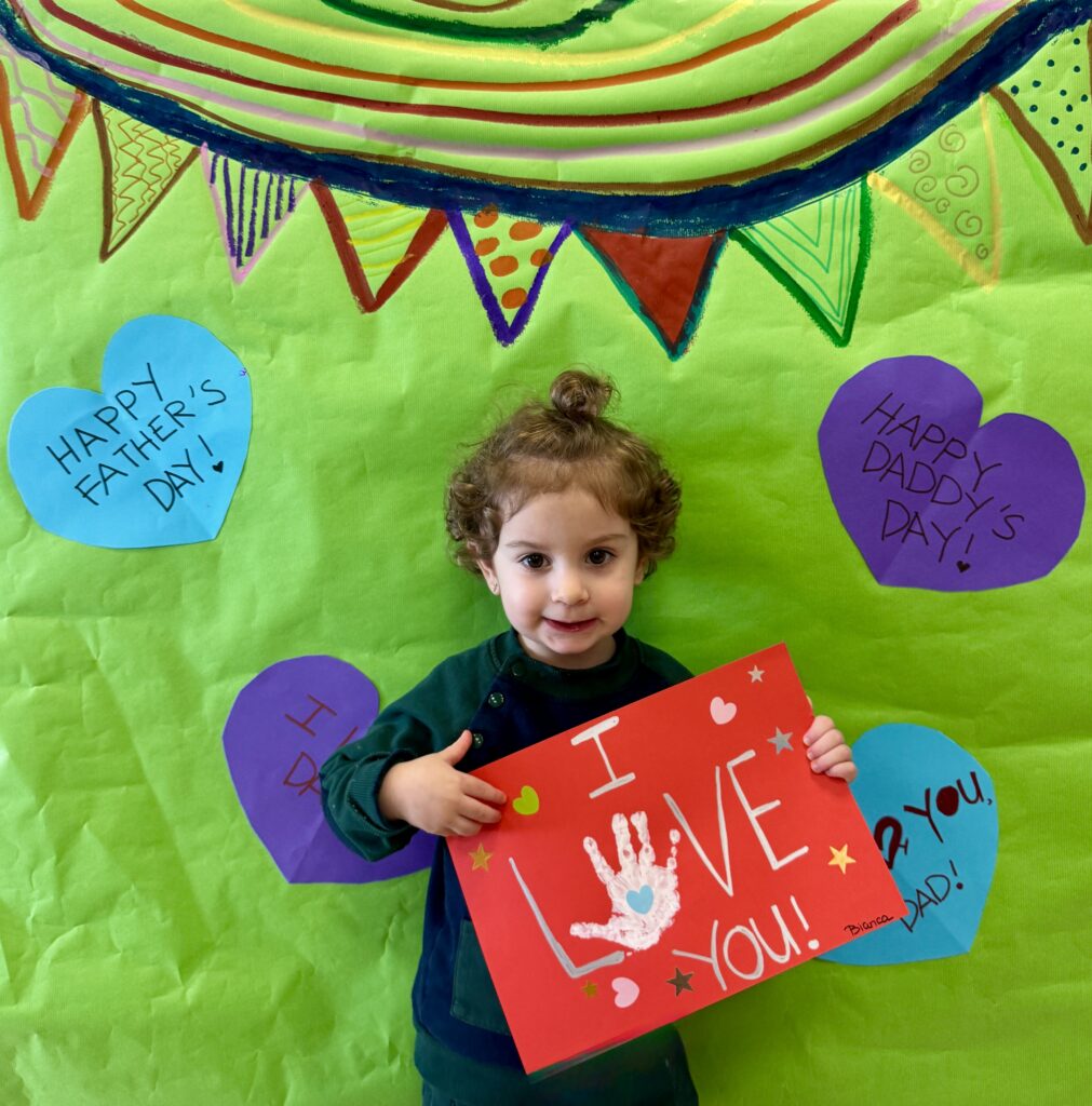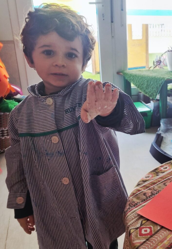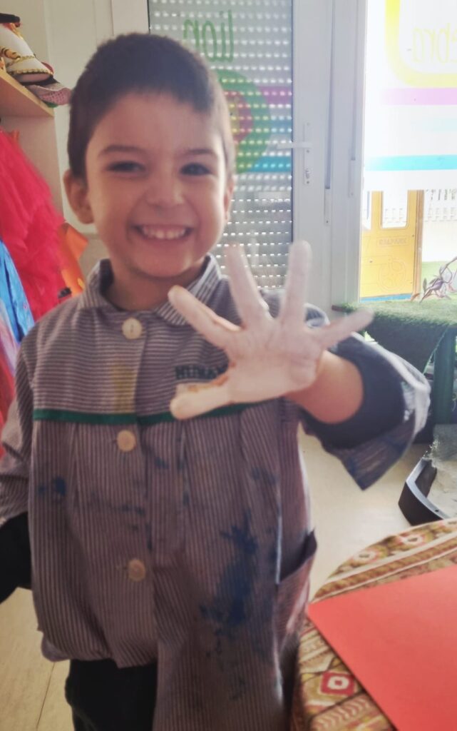 Nuestros pequeños crearon unas adorables tarjetas con la huella de su mano. Con la ayuda de sus profes, escribieron el mensaje “I love you” y decoraron sus tarjetas con pegatinas de corazones y estrellas de muchos colores. ¡Cada tarjeta quedó única, igual que nuestros peques!
