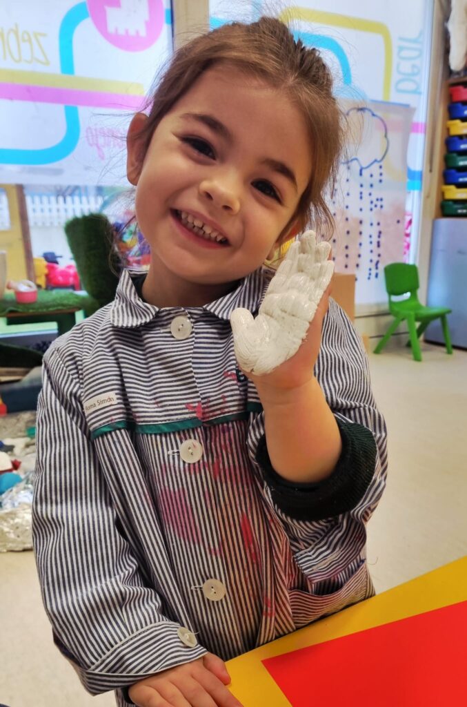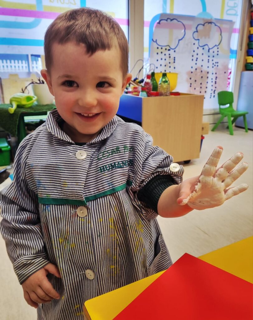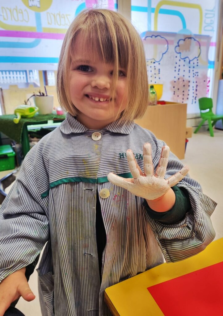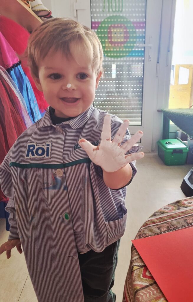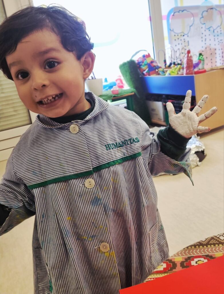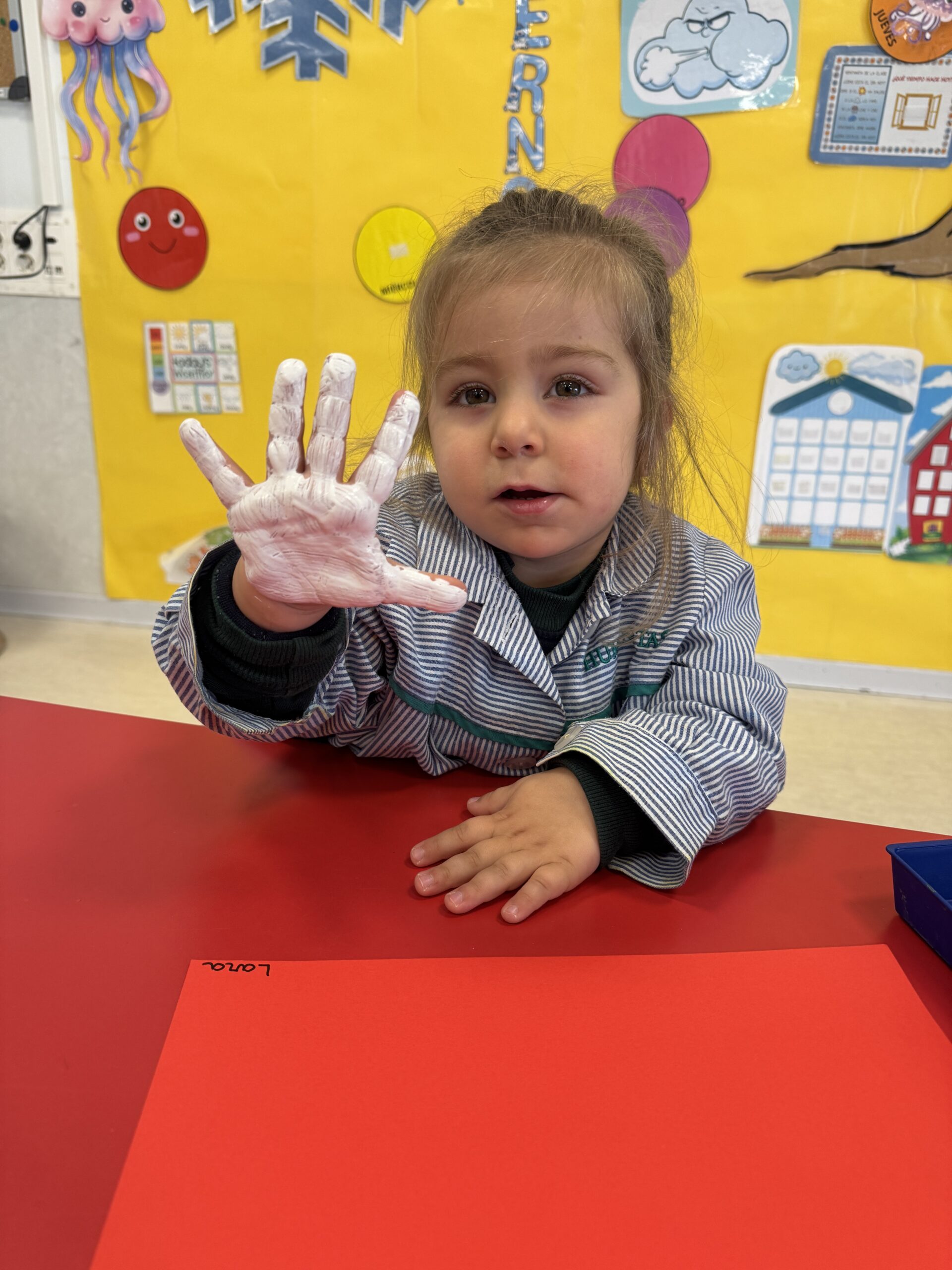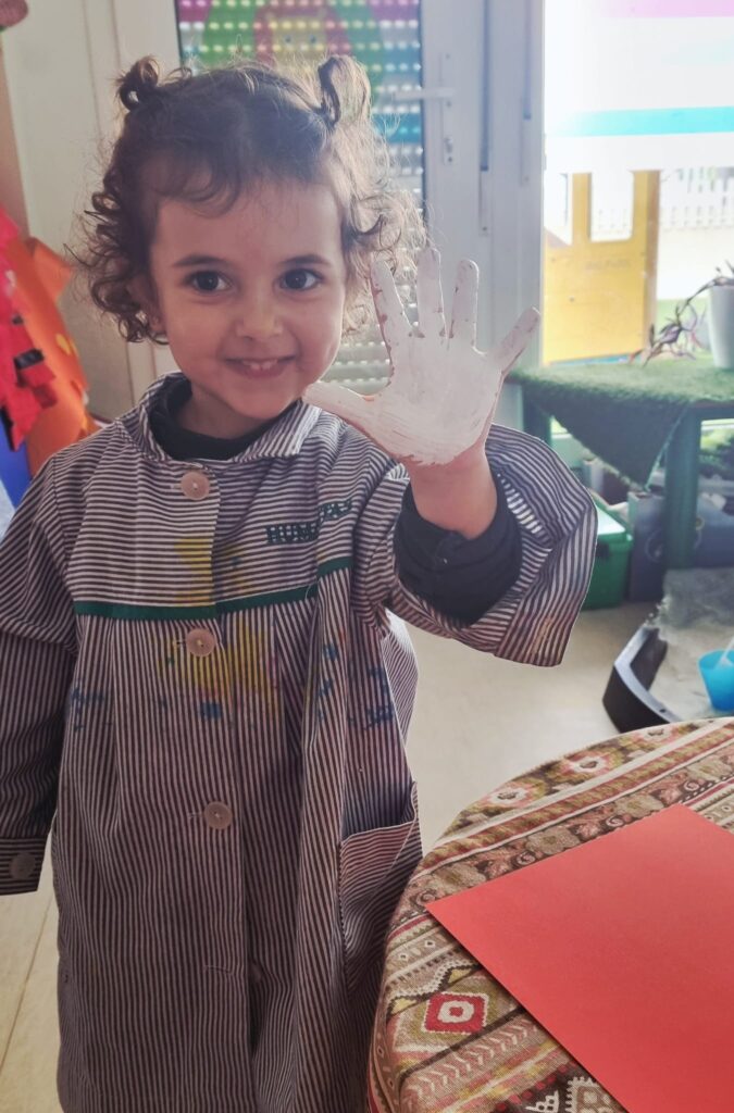 Nuestros pequeños crearon unas adorables tarjetas con la huella de su mano. Con la ayuda de sus profes, escribieron el mensaje “I love you” y decoraron sus tarjetas con pegatinas de corazones y estrellas de muchos colores. ¡Cada tarjeta quedó única, igual que nuestros peques!