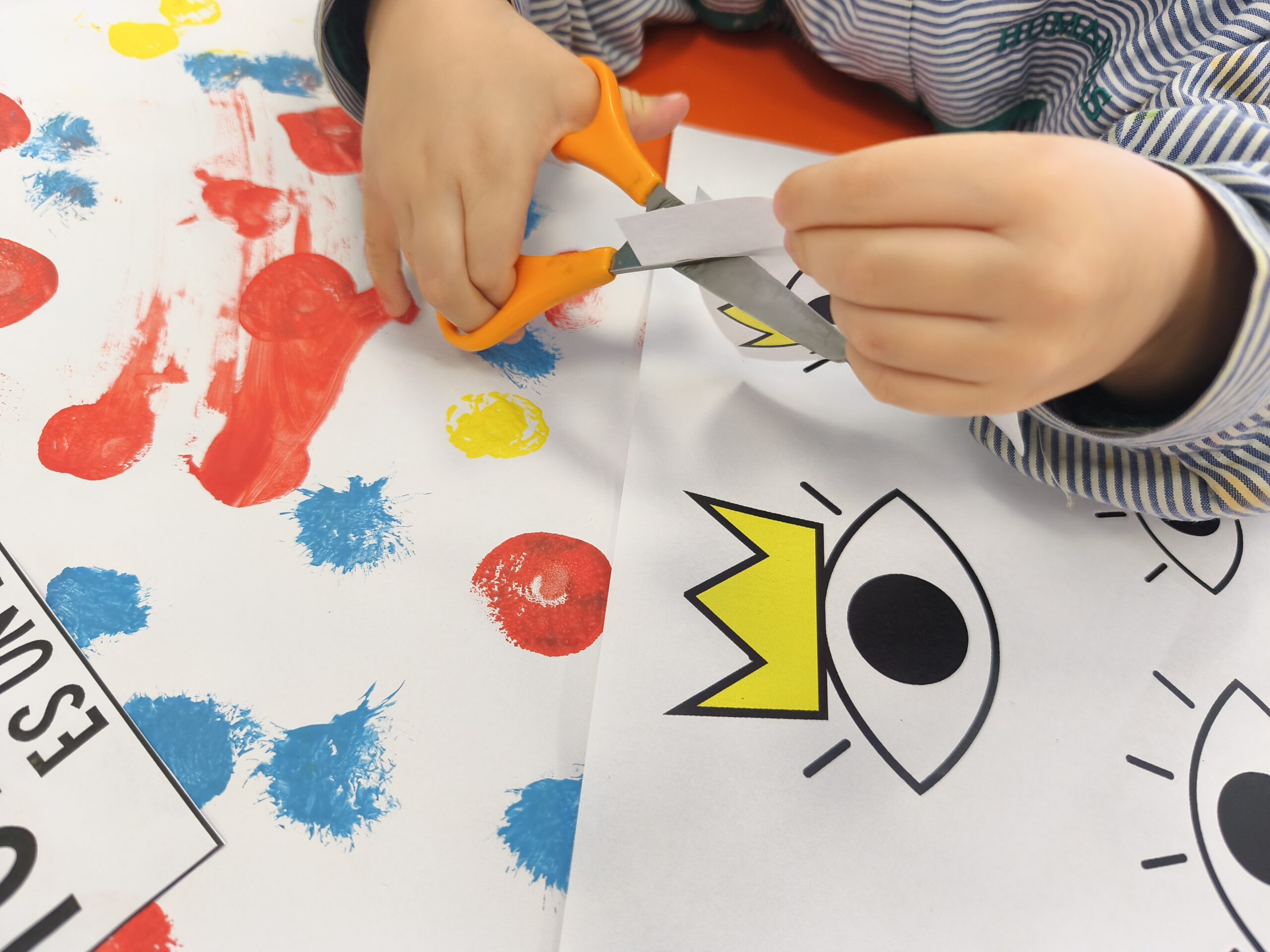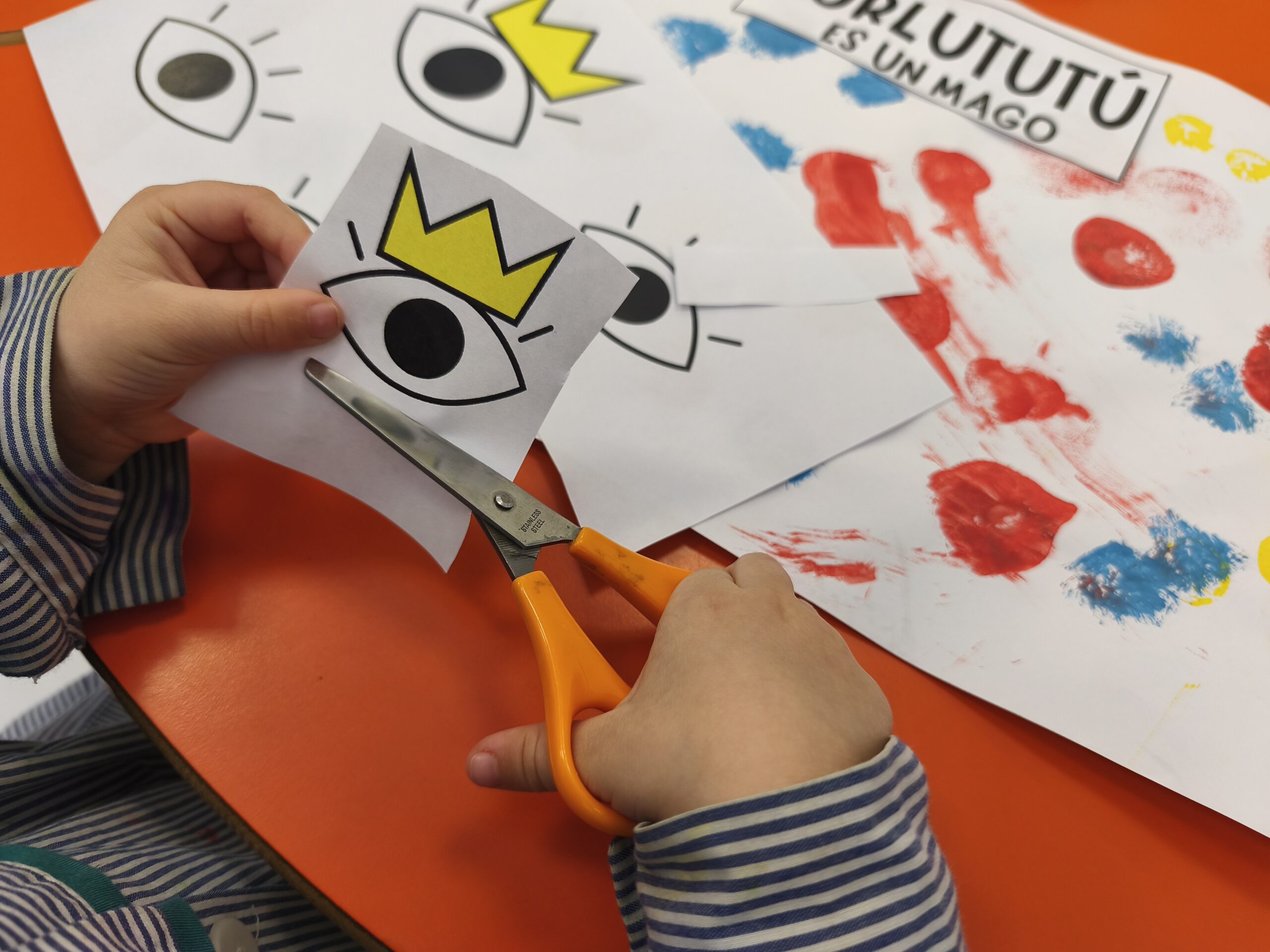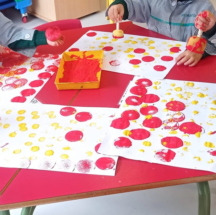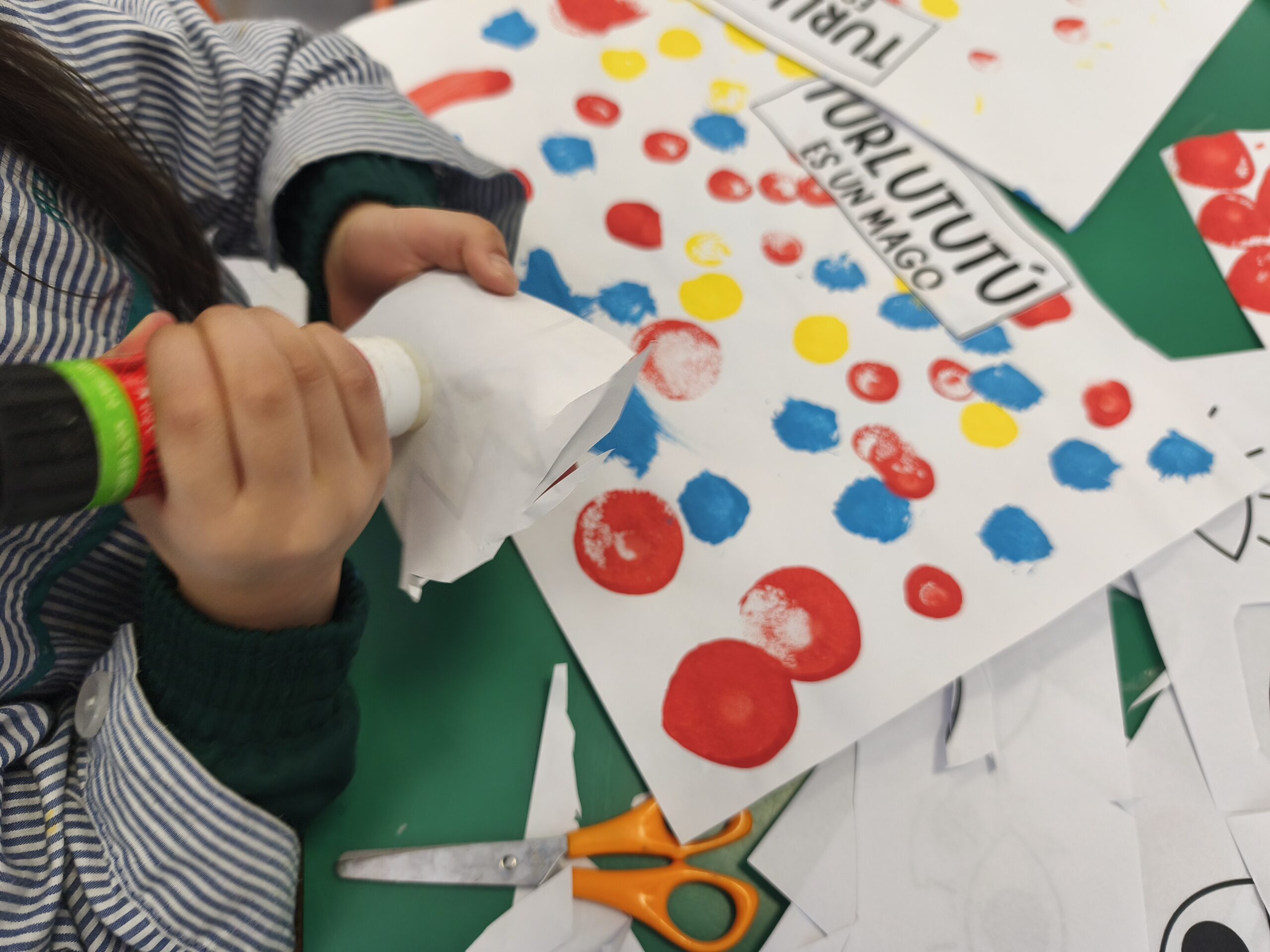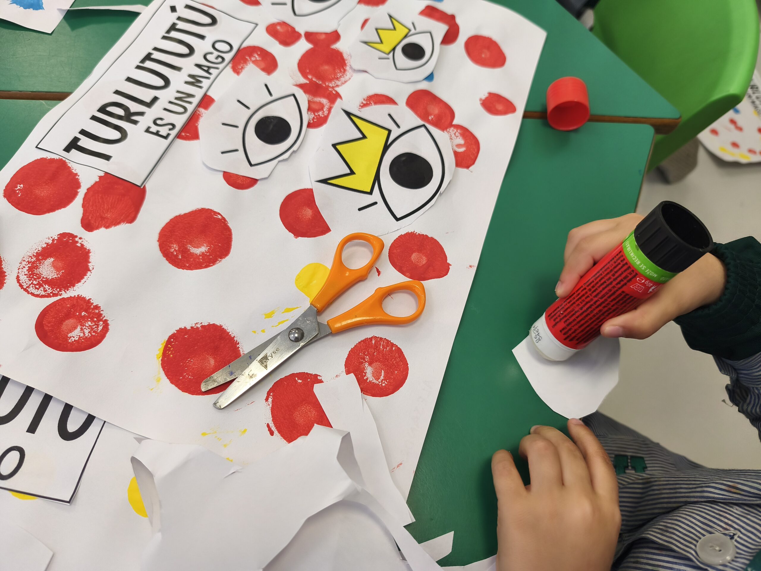 Hemos conocido al mago Turlututú, un cuento de Hervé Tullet con el que nos hemos reído mucho. Inspirándonos en él, hemos realizado nuestra creación a través de la estampación de pintura y del recortado y pegado, consiguiendo verdaderas obras de arte.