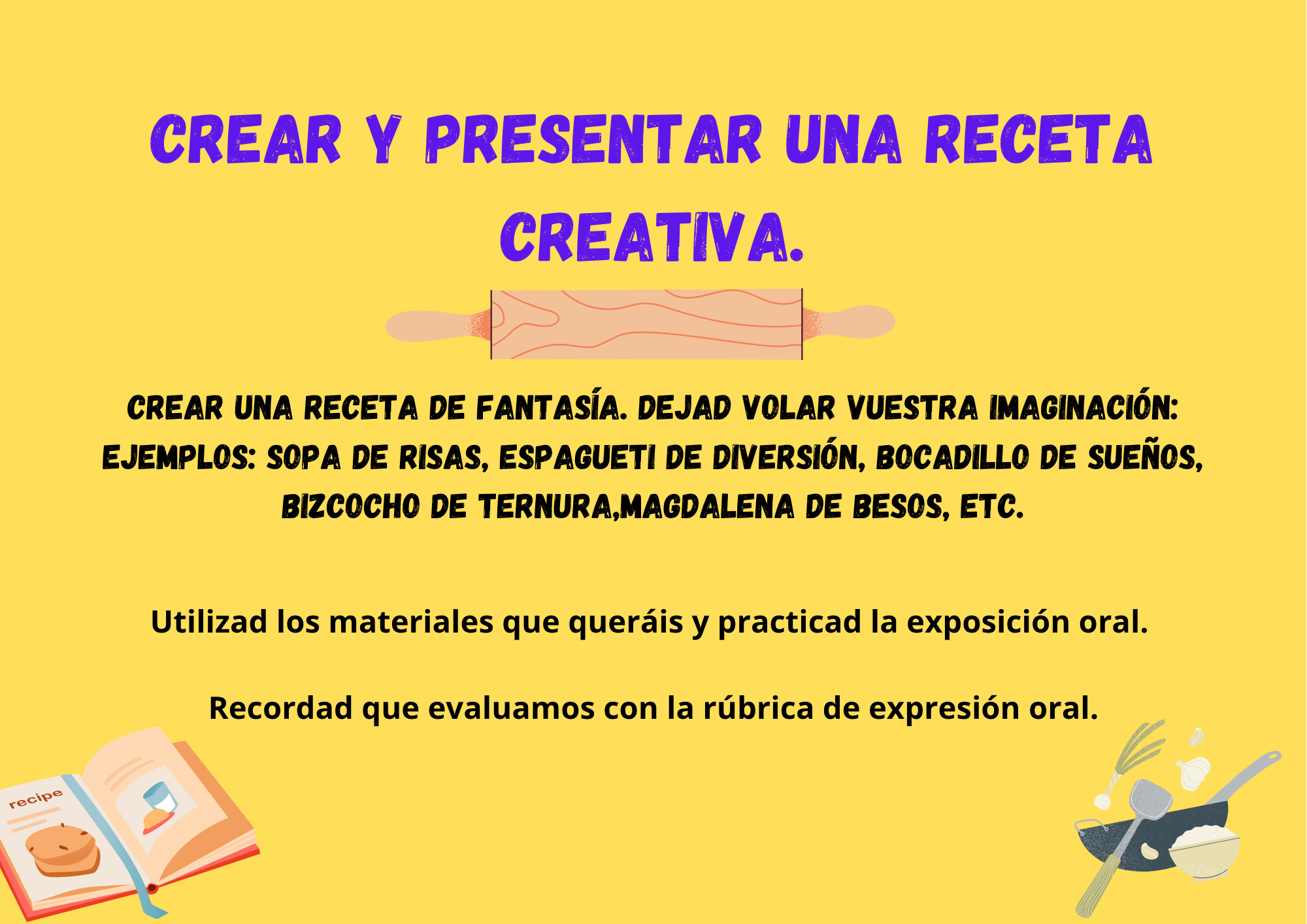 MATERIALES: Os mandamos una plantilla en A3 para escribir y diseñar. El diseño de la  imagen lo podéis hacer con la técnica de collage, fotos,recortes, lana, purpurina… Lo único que no sea muy grueso ya que luego juntaremos todas las recetas en un libro de la clase. 🙂