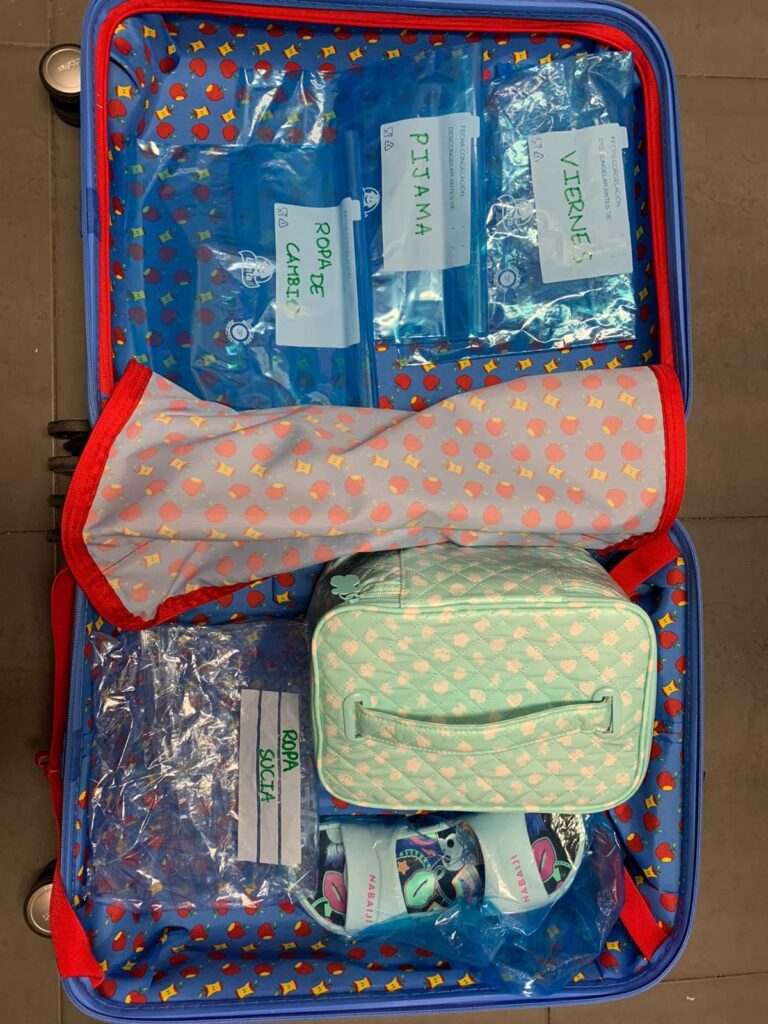 Para facilitaros la labor del equipaje, lo más importante es que los niños formen parte activa en su preparación. Eso les dará seguridad cuando tengan que organizarse. Si aún no leen podéis realizarlo con símbolos (luna , sol) y con números (1º y 2º), pero siempre marcados con el nombre (eso lo identifican muy bien). No olvidar una gorra para el sol, crema solar de fácil manejo y repelente de mosquitos en formato roll on o stick, la linterna para ir en busca de las estrellas y del duende Zacarías, y si es necesario una figura de apego para ir a dormir y sentirse como en casa.
